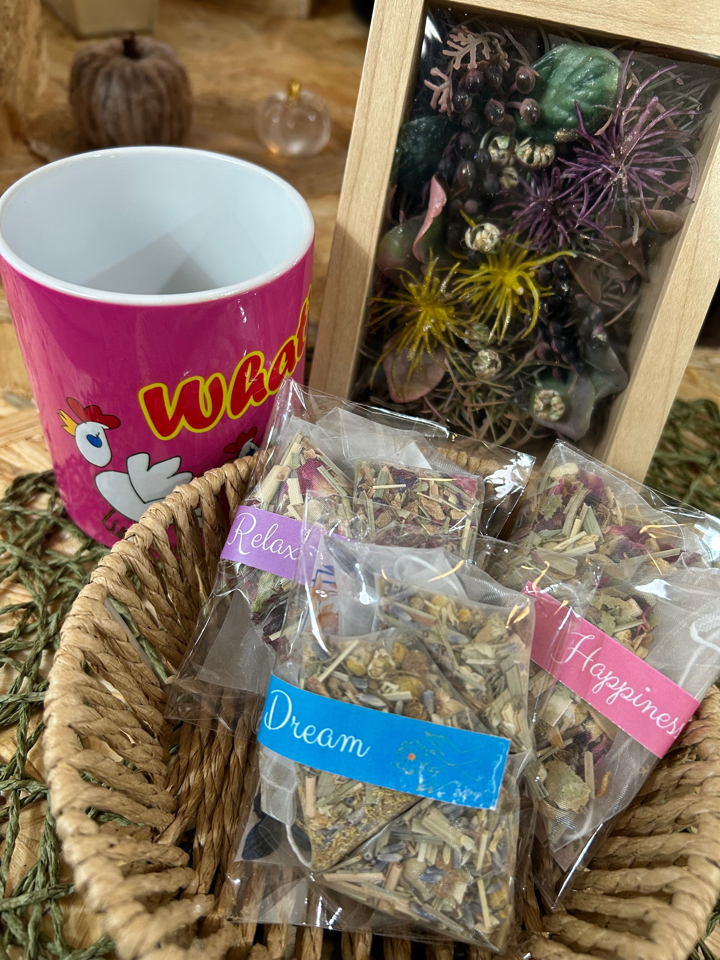 フェイクグリーンインテリア×1、ハーブティー3種類×各1、マグカップ×1