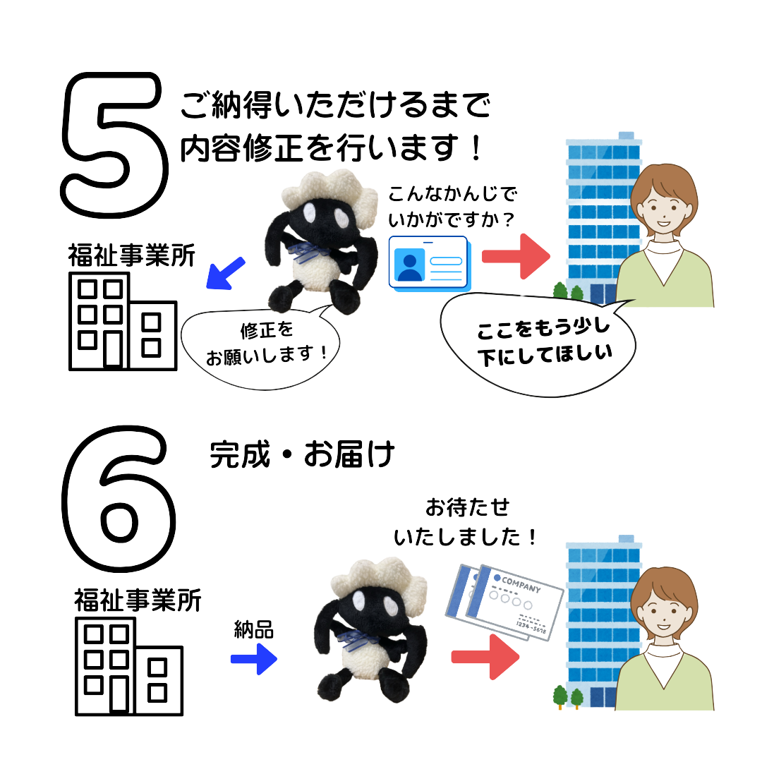 用途やイメージを共有し、デザインのご提案をさせていただき、納得がいくまで一緒に考えます。(デザインは、福祉事業所とル・カシエの協働で行います★)